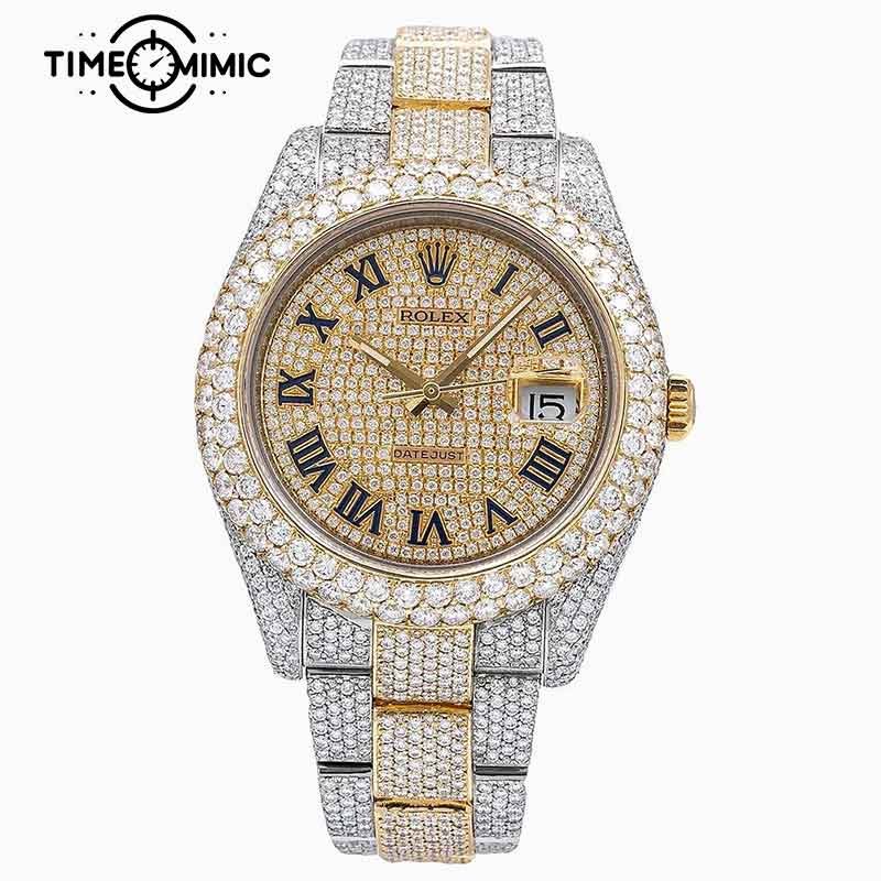 SKU Fully Iced Out Rolex Datejust Gold Twe-Tone Black Rome Numeral Dial Replica Categories , , , , Tags , , , ,