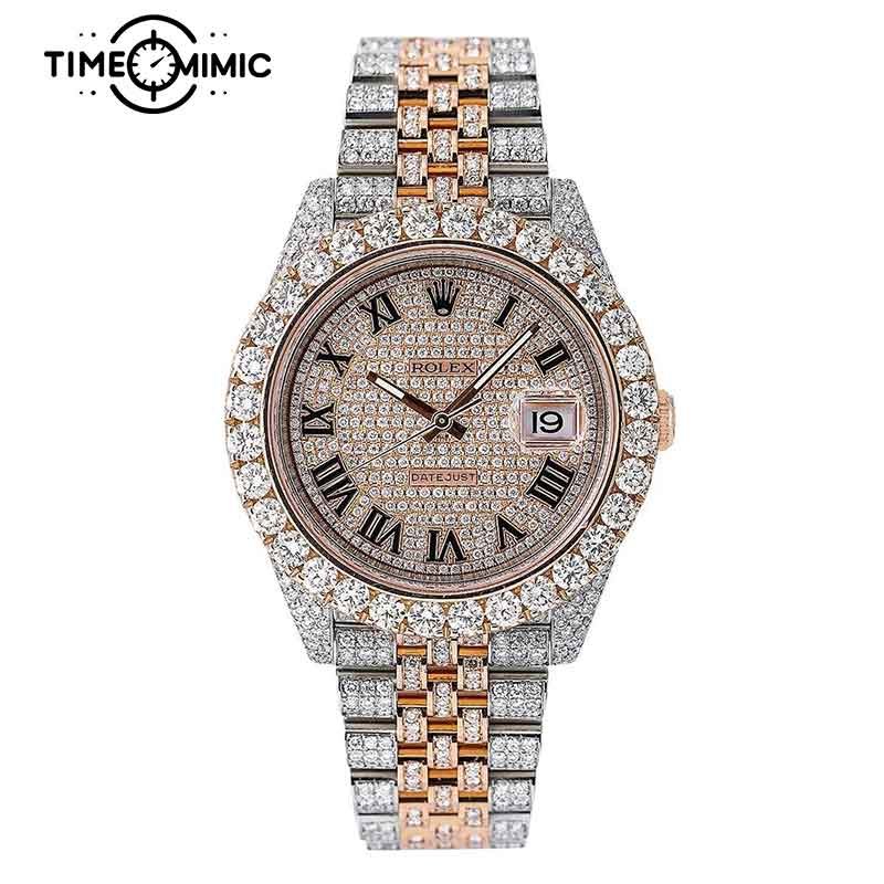 SKU Fully Iced Out Rolex Datejust Rose Gold Twe-Tone Rome Numeral Dial Replica Categories , , , , Tags , , , ,