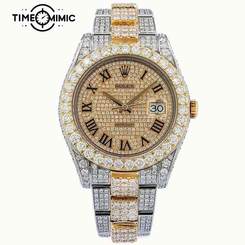 SKU Replica Fully Iced Out Rolex Datejust Gold Twe-Tone Black Rome Numeral Dial Categories , , , , Tags , , , ,