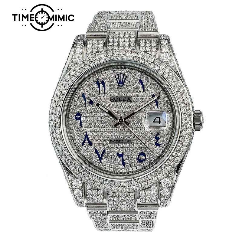 Supper Replica Fully Iced Out Rolex Datejust Diamond Blue Arabic Numeral Dial Fake Watches Clone