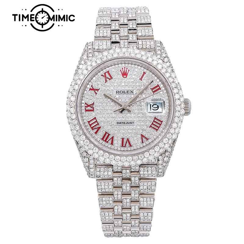 SKU Fully Iced Out Rolex Datejust Diamond Red Rome Numeral Dial Jubilee Replica Categories , , , , Tags , , , ,