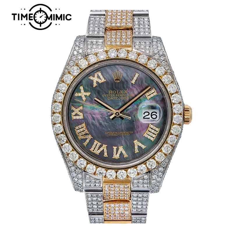 SKU Iced Out Rolex Datejust Black Mother-of-Pearl Roma Number Dial Gold Twe-Tone Replica Categories , , , , Tags , , , ,