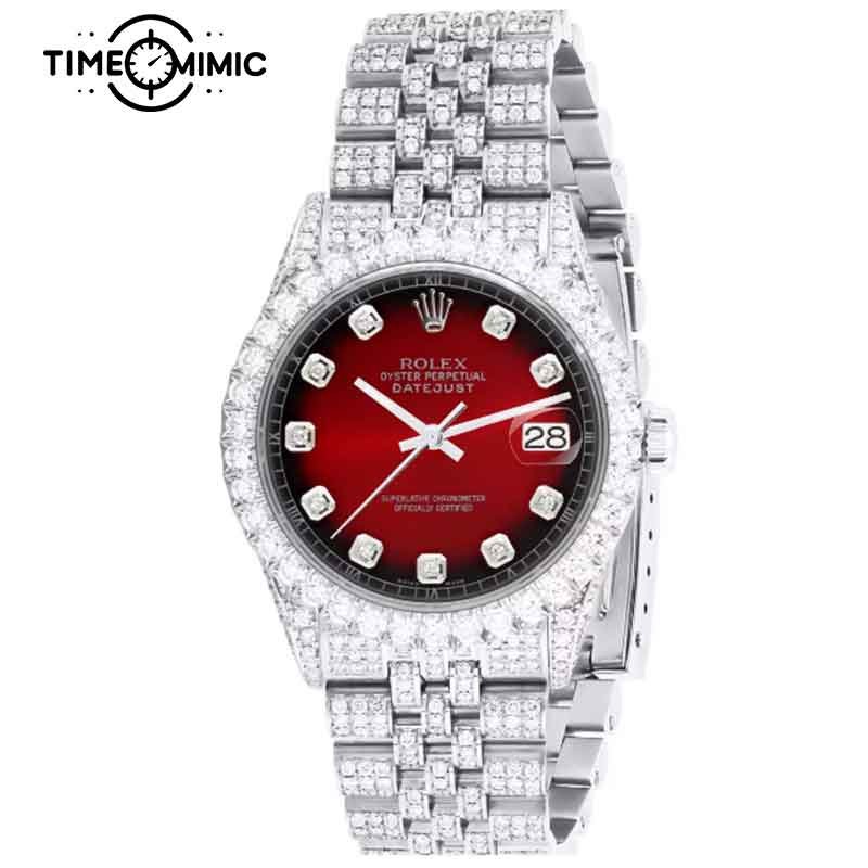 SKU Iced Out Rolex Datejust Diamond Scale Red Gradient Dial Jubilee Replica Categories , , , , Tags , , , ,
